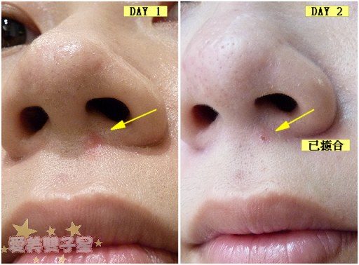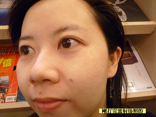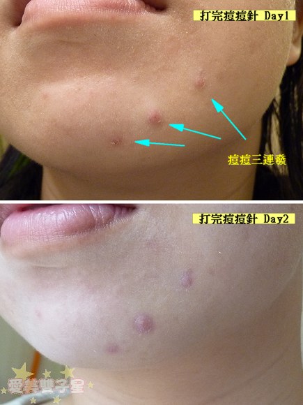 不過上圖應該不難看出,在打完痘子隔天,紅腫的痘子就消下去了,我這幾顆痘痘,都是不能擠的那種,