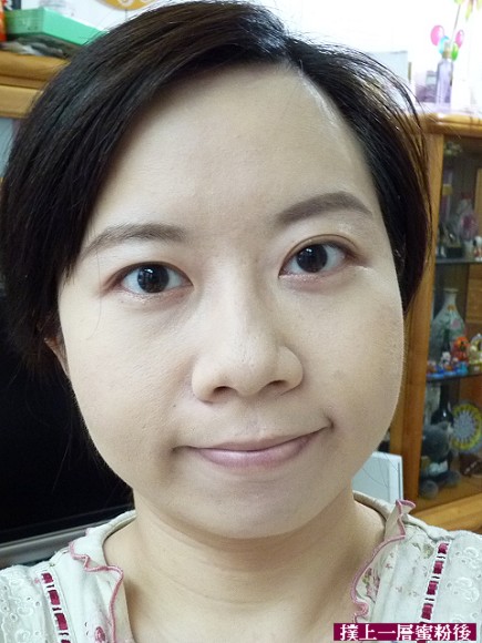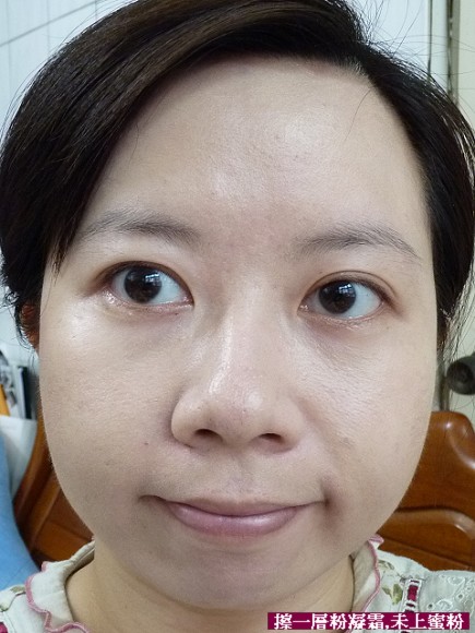 再來,就是要看看擦在臉上的感覺,下圖為全臉都上一層水凝霜了,但還沒有撲蜜粉之前: